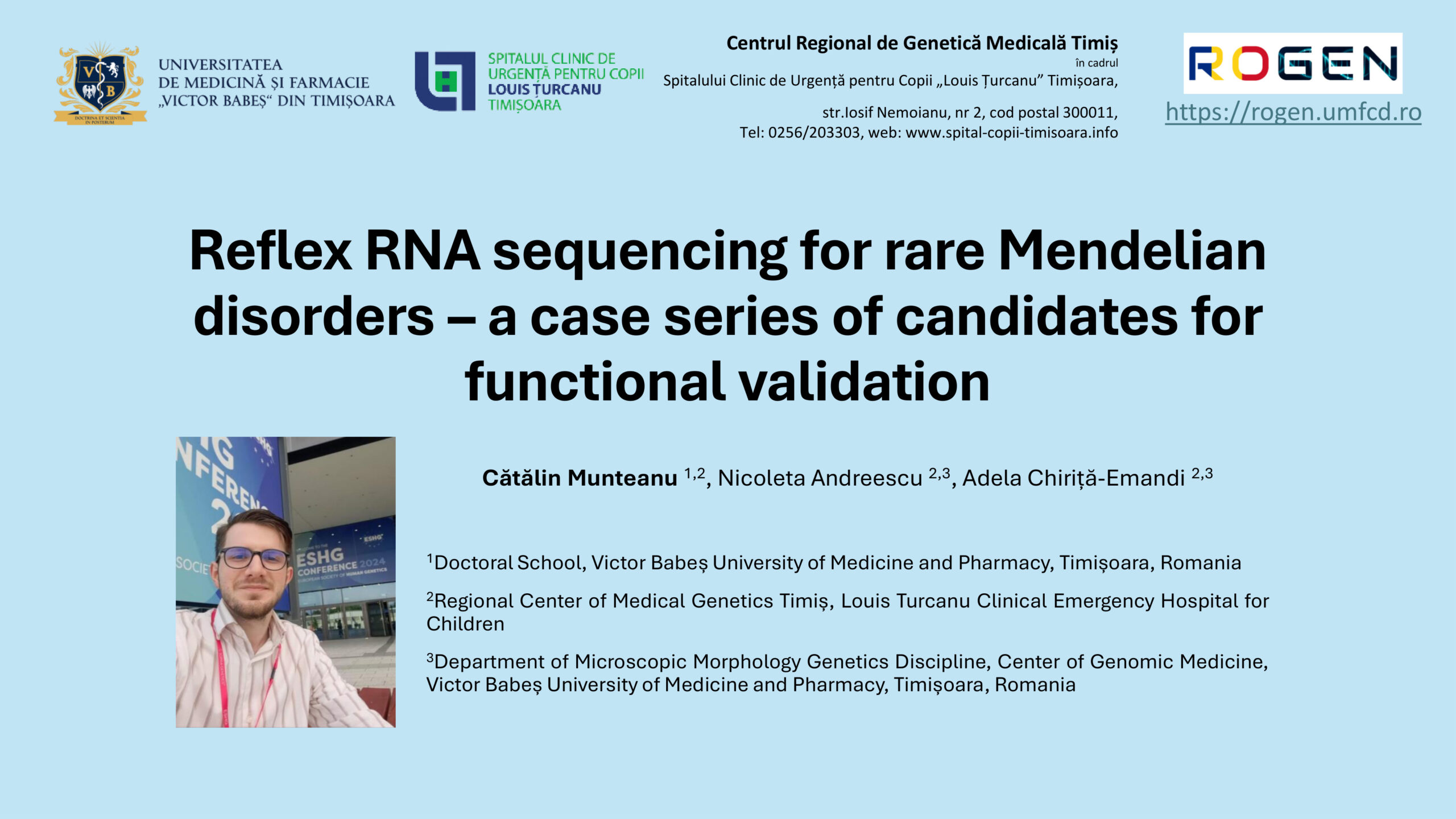 Universitatea de Medicină și Farmacie „Victor Babeș” din Timișoara, partener în proiectul ROGEN, a fost reprezentată de Prof. Adela Chiriță-Emandi și Dr. Cătălin Munteanu, care a susținut prezentarea „Reflex RNA sequencing for rare Mendelian disorders – a case series of candidates for functional validation”.