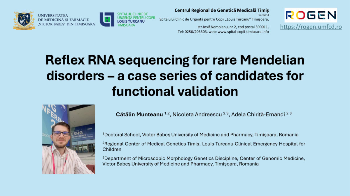 În cadrul ediției a XV-a a Conferinței Naționale de Genetică Medicală, echipa ROGEN a fost prezentă activ, aducând în prim-plan contribuții importante pentru progresul genomicii în România. Universitatea de Medicină și Farmacie „Victor Babeș” din Timișoara, partener în proiectul ROGEN, a fost reprezentată de Prof. Adela Chiriță-Emandi și Dr. Cătălin Munteanu, care a susținut prezentarea