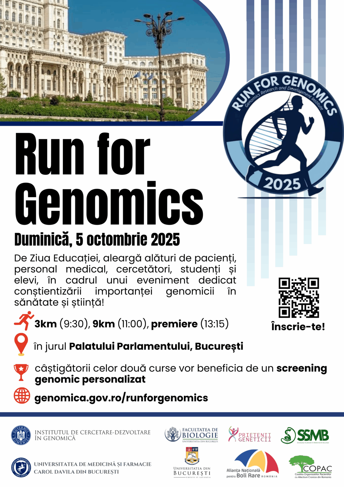 În scopul conștientizării și implicării publice, UMFCD și partenerii proiectului ROGEN susținevenimentul „Run for Genomics” – o manifestare dedicată importanței genomicii pentru sistemelenaționale de sănătate și de cercetare, organizată în parteneriat cu mediul academic și organizațiilede pacienți. Evenimentul are loc duminică, 5 octombrie 2025, în perimetrul Palatului Parlamentului(zona Parcul Izvor), și include curse de 3